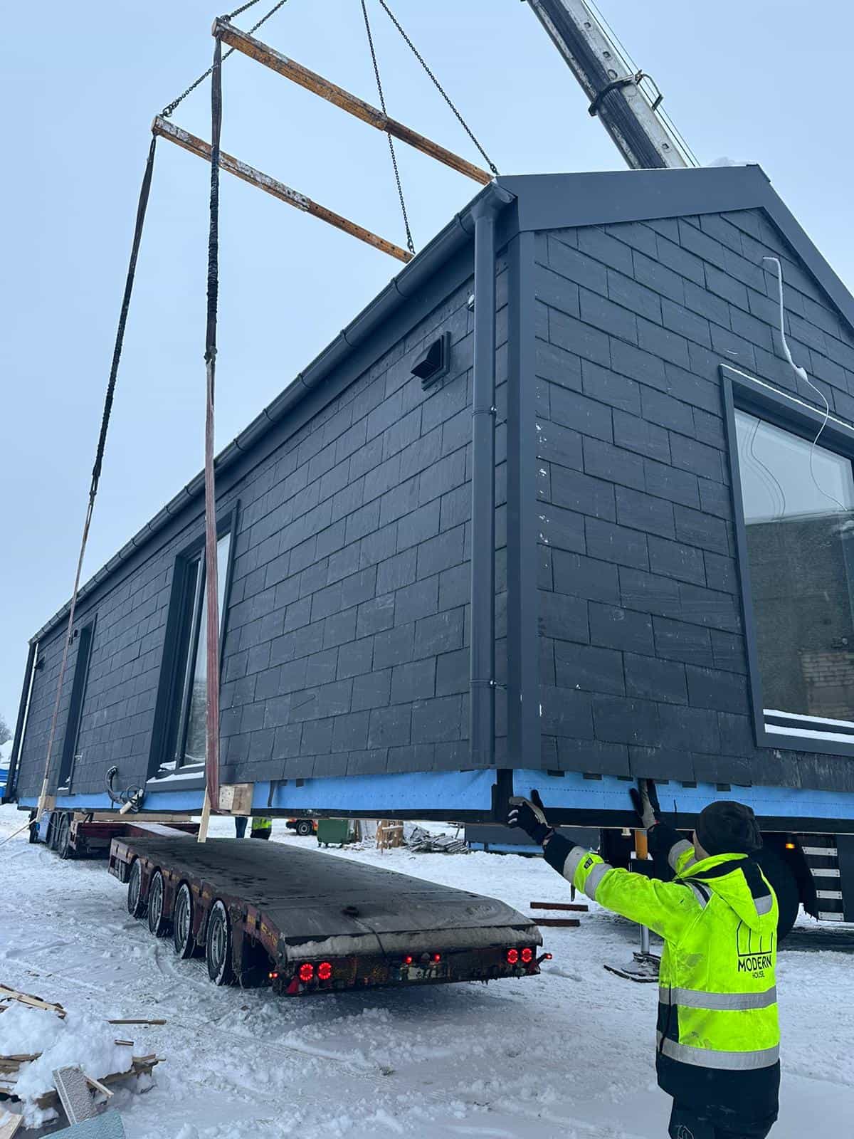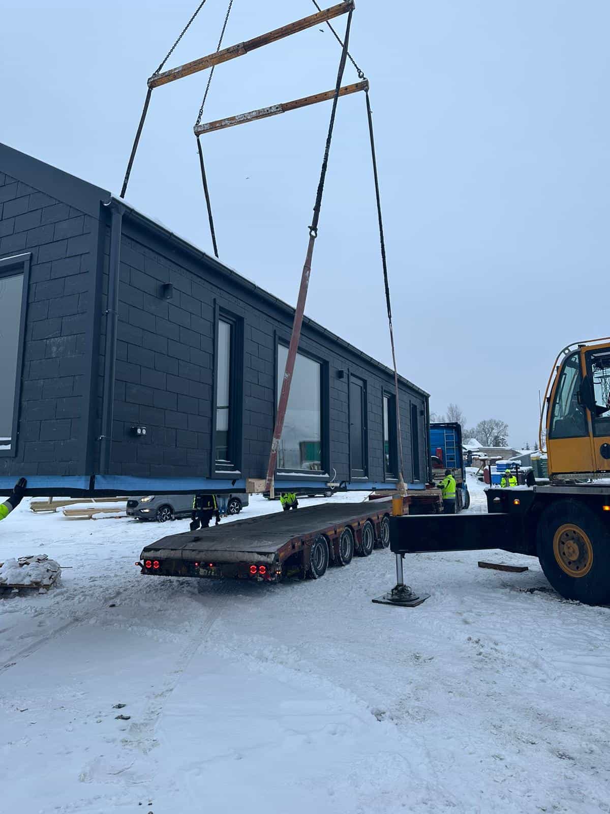 En åpen lastplattform ble brukt for å transportere modulhuset. Bygningen ble plassert på plattformen og på de forhåndsforberedte søylefundamentene med hjelp av en kran.